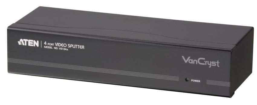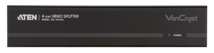 VS134A — четырехпортовый разветвитель (Video splitter) аналогового видеосигнала. VS98A дублирует видеосигнал от одного источника на четыре устройств отображения (мониторы). Одновременно видеоразветвитель усиливает сигнал, что позволяет отдалить монитор от источника сигнала на расстояние до 65 м.
