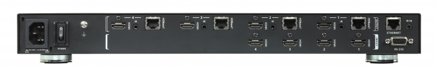 Поддерживает 4 HDMI-входа и HDBaseT- выхода. Дополнительные 4 выхода с HDMI интерфейссм используются только для подключения контрольных мониторов.