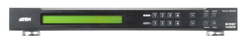 Mатричный HDMI коммутатор VM3404H предназначен для коммутации 4-х источников сигналов HDMI видео 4K/Full HD c 4-я соответствующими устройствами отображения в любой комбинации. Дополнительно устройство может коммутировать управляющие сигналы ИК и RS232. VM3404H имеет функционал формирования видеостены размером 2х2. Благодаря поддержки технологии HDBaseT-Lite устройство обеспечивает передачу сигналов к устройствам отображения на расстояние до 40/70 метров используя один кабель Cat 6a