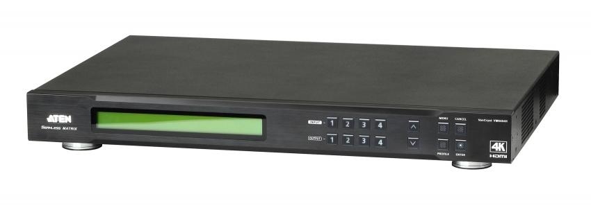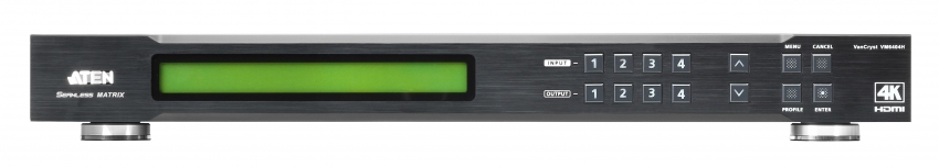 Матричный HDMI переключатель компании ATEN VM6404H позволяет одновременно подключить четыре HDMI-источника к четырем различным устройствам отображения HDMI сигнала (мониторам, дисплеям или проекторам). Устройство поддерживает два самых современных стандарта 4K видео разрешений: 3840 x 2160 и 4096 x 2160. VM6404H позволяет выполнять мощную обработку видео высокой четкости, выдавая изображение в разрешении 4K на четыре дисплея. Устройство поддерживает независимое подключение любого порта выхода к любому порту входа.