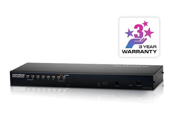 KVM-переключатель KH1508Ai линейки Altusen – устройство, обеспечивающее доступ к 8 компьютерам с локальной KVM-консоли или c удаленной через INTERNET/LAN. При шлейфовом подключении переключателей KH1508Ai можно увеличить число управляемых компьютеров до 128.