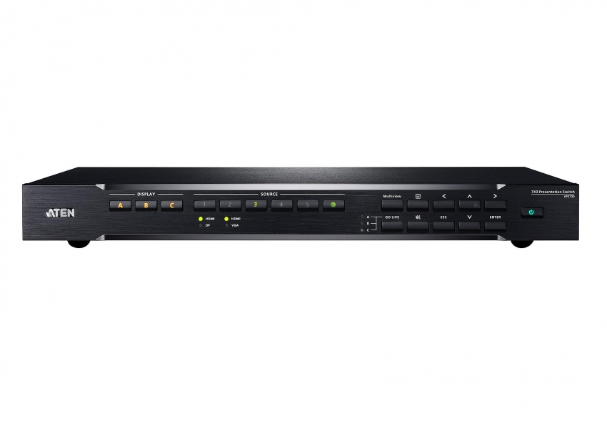 Коммутатор для проведения презентаций VP2730 компании ATEN сочетает в себе множество функций - матричного видео-переключателя с масштабатором, c потоковой передачей, аудиомикшером, а также HDBaseT-удлинителя и аналого-цифрового преобразователя, которые объединены в одно компактное устройств. Коммутатор, обладая семью входными портами (1 х VGA, 1 х DisplayPort, 5 х HDMI), позволяет осуществлять вывод изображения высокой четкости на один HDBaseT и два HDMI-выхода. VP2730 дает возможность проводить крупномасштабные встречи и облегчает взаимодействие между локальными и удаленными участниками в залах заседаний, в комнатах для видеоконференций, в лекционных залах или в классах дистанционного обучения.
