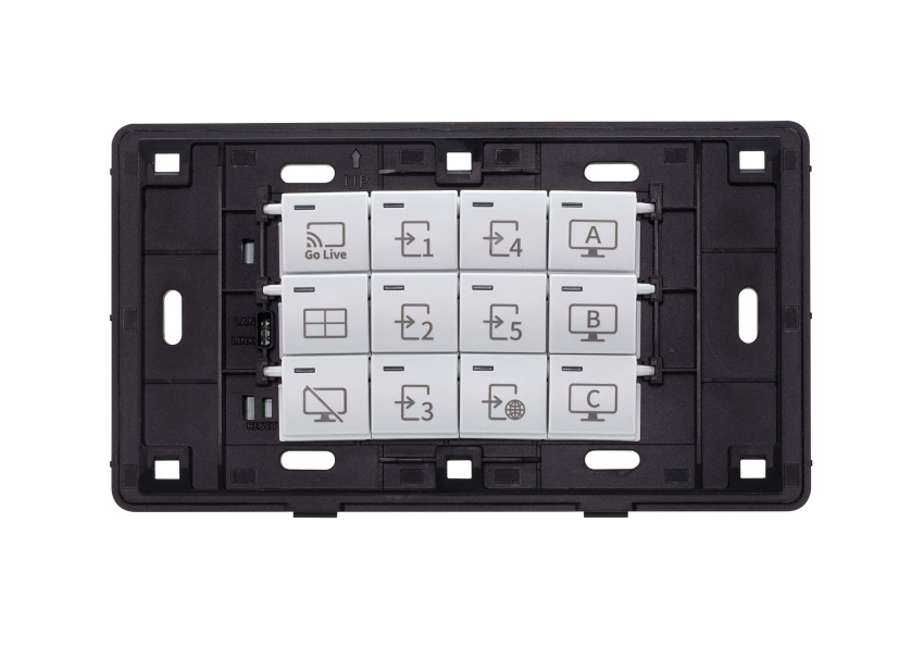 Блок представляет возможность управления с настенной клавиатуры функциями подключенного презентационного переключателя. Конструктивно блок выполнен под установку в стандартную двухсекционную (EU, 2 gang) установочную коробку, предназначенную для скрытого монтажа в стену (или столешницу).