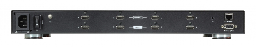 Коммутирует каждый из 4-х подключенных HDMI источников с любым из 4-х HDMI устройств отображения.