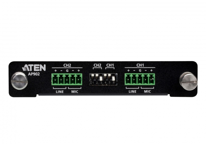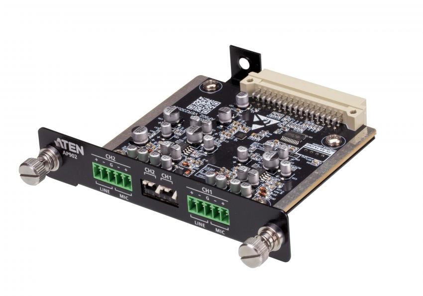 AP902 — 2-канальная плата расширения модели AP902, предназначена для использования с усилителями мощности серии AP DSP компании ATEN, и позволяет данным усилителям получить 2 входных звуковых канала. Она способна обрабатывать балансные / несбалансированные звуковые сигналы в диапазоне от уровня микрофона до линейного уровня. Это упрощает соединение усилителей с источниками звука, поступающего от микшеров, медиаплееров или другого звукового оборудования, используемого в применениях для живого звука профессионального уровня, повышая гибкость и универсальность аудиосистемы. Схема предусилителя спроектирована для снижения уровня шума и улучшения динамического диапазона, чтобы обеспечить превосходное воспроизведение звука для двух дополнительных микрофонных входов, которые плата расширения добавляет к усилителям мощности серии AP2. Это делает ее идеальным решением в применениях с усилением звука, таких как системы вещания и лекционные залы.