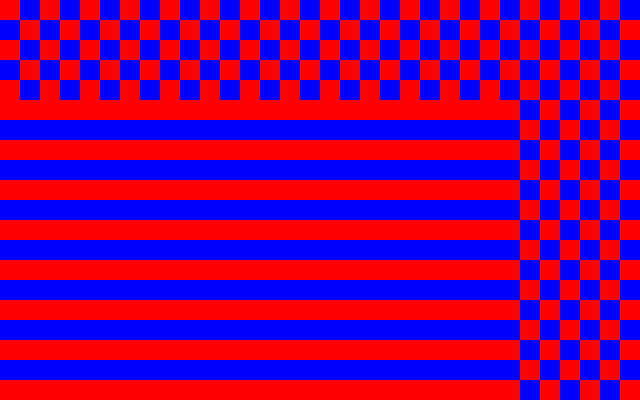 Тем же, кому интересно, как действует этот тест, а также тем, кто видит 4:2:2 и не видит 4:4:4 (или видит примерно одинаково и 4:4:4, и 4:2:2) и при этом хочет попробовать исправить ситуацию, нужно знать, что картинку нужно смотреть издали (c расстояния более диагонали) и ОБЯЗАТЕЛЬНО в НАТУРАЛЬНУЮ ВЕЛИЧИНУ, пиксель-в-пиксель (т.е. при суммарном 100% масштабе), поскольку увеличение или уменьшение картинки по сравнению с реальным размером дает неверный результат теста. Неважно, каким образом Вы этого добьетесь (с помощью браузера, вьювера или каким-то иным путем), важно, чтобы картинка выводилась на экран пиксель-в-пиксель!